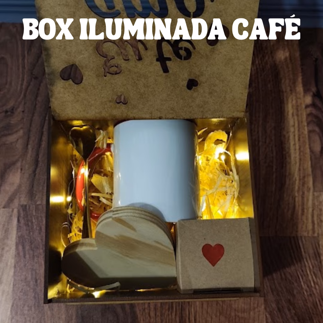 Box Iluminada Música Acompanha Box com luzes led a pilha, com frase na tampa, caneca personalizada, porta caneca coração pinus personalizada, colher coração e monóculo.