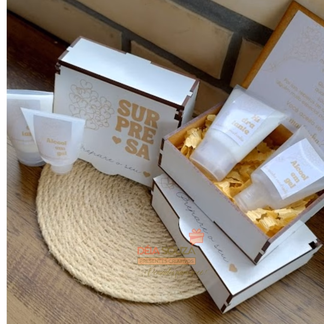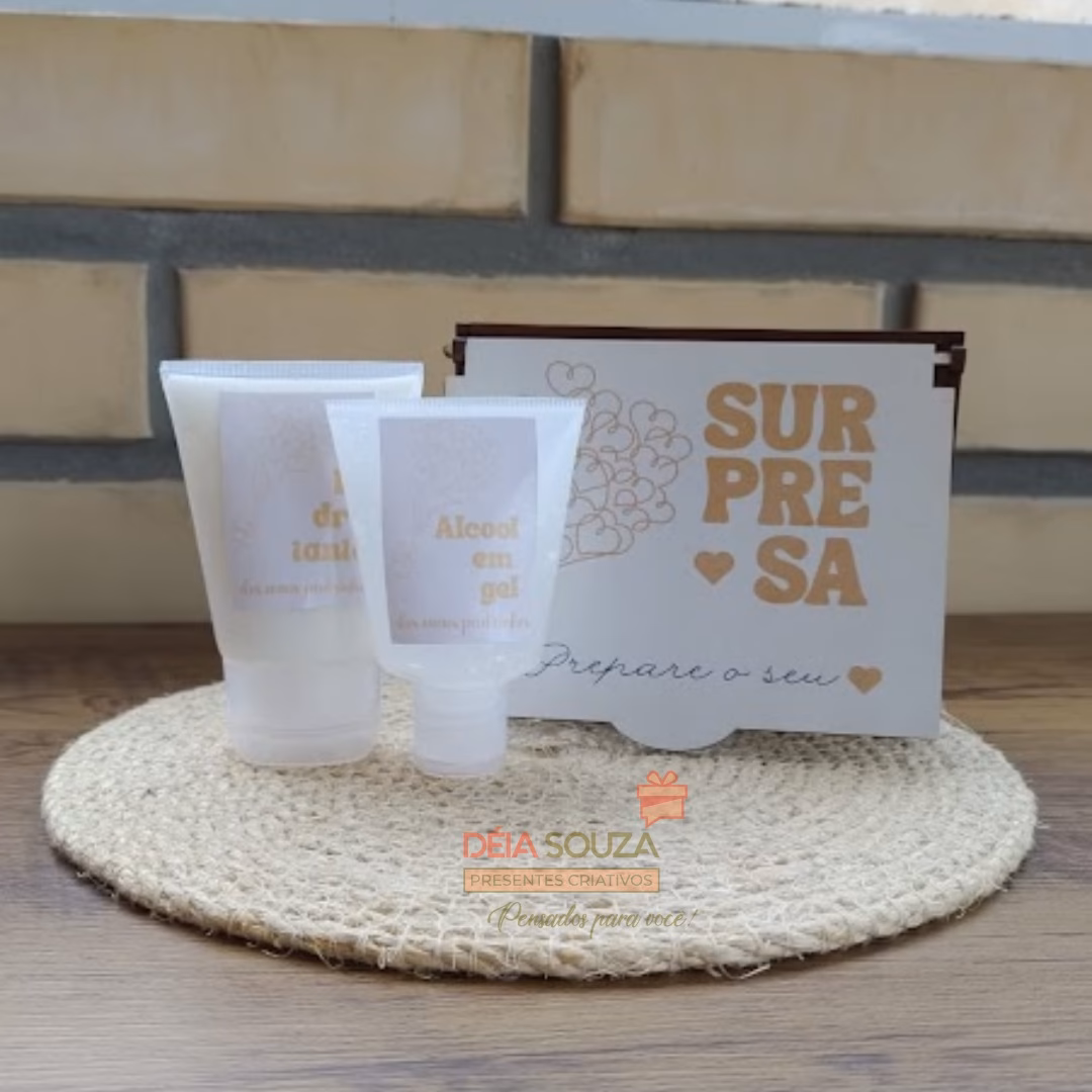 Kits de caixas de MDF com tampa personalizada com impressão ultra violeta na parte externa e adesivada na parte interna com 2 hidratantes ou 2 álcool em gel ou 1 hidratante e 1 álcool gel com rotulo personalizado
