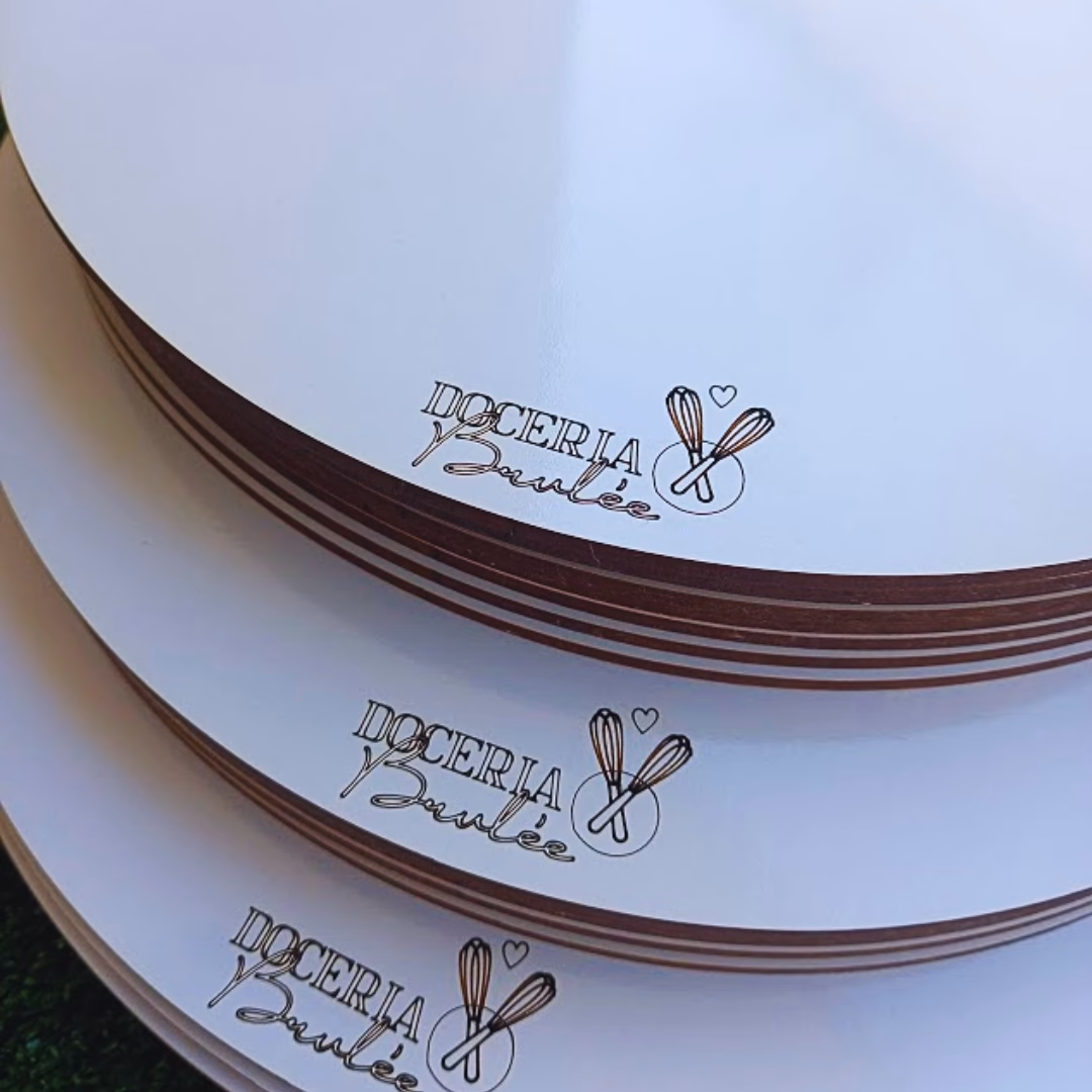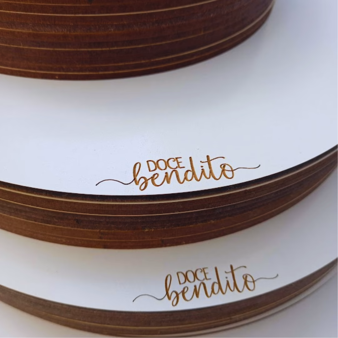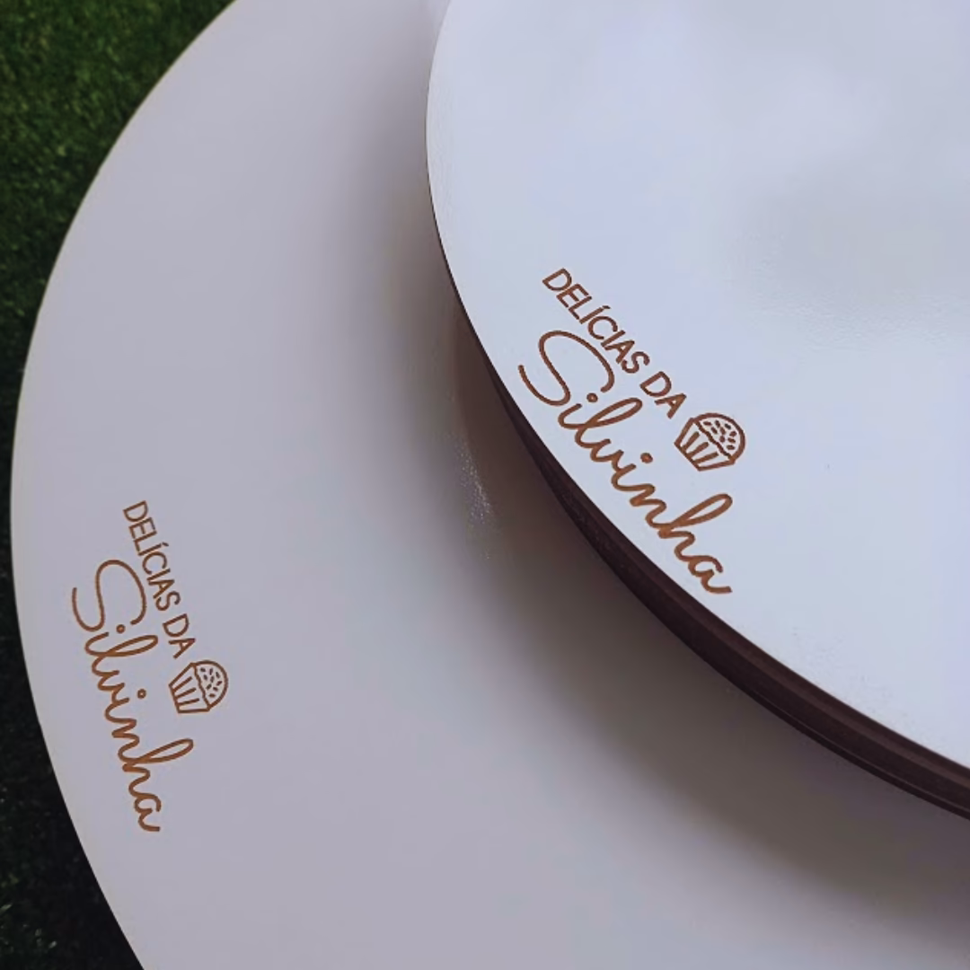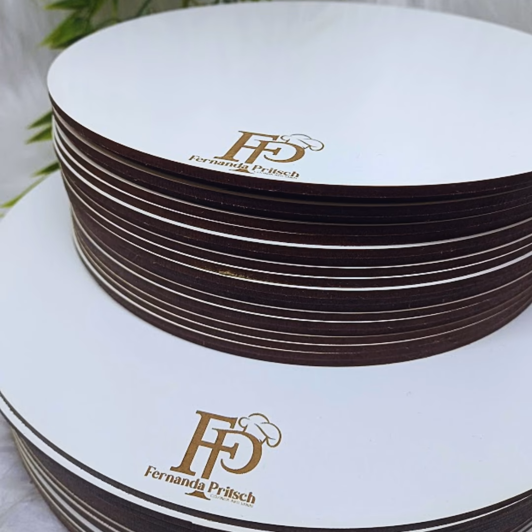 Cake Board Redondo Personalizado Produzido em MDF de 3mm laminado trazendo mais qualidade na apresentação do seu trabalho; Personalizado com sua logo através de gravação laser e corte de alta precisão.