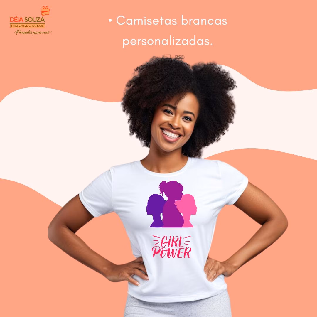 Camiseta Poliéster Branca Personalizada Dia da Mulher Tecido Poliéster. Arte personalizada de acordo com sua ideia. Arte sublimada.