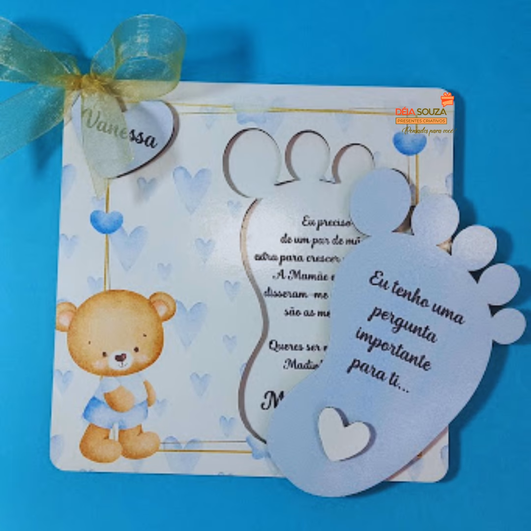 Convite Pezinho Pura delizadeza neste convite para os futuros Dindos do seu Bebê. A porta da maternidade ou até mesmo para ser usado em um ensaio gestante, criando memórias inesquecíveis. Produzido em MDF de 3mm duplado , cortada a laser e...