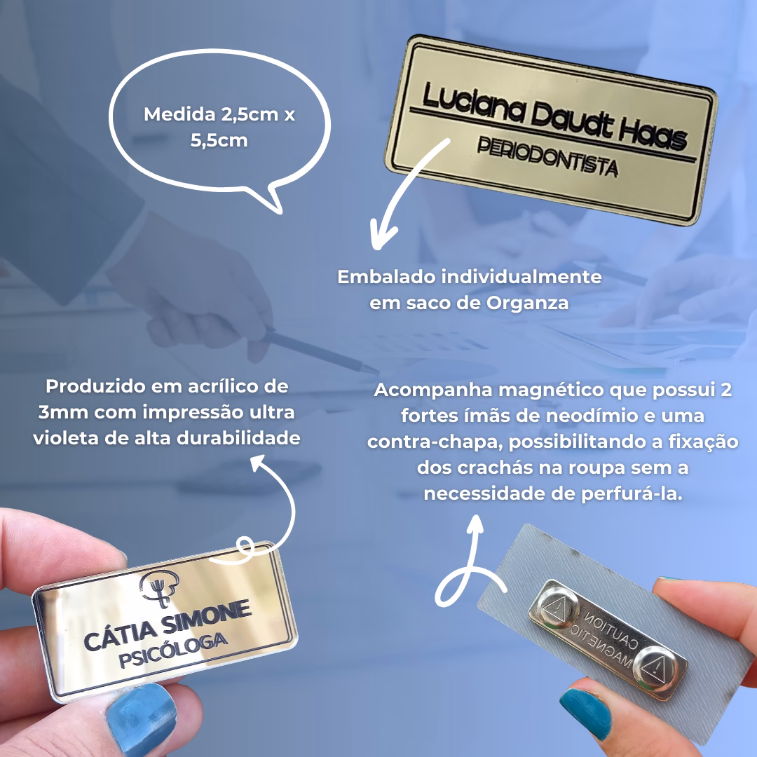 Crachá magnético (acrílico prata) Produzido em acrílico espelhado de 3mm Acompanha magnético que possui 2 fortes ímãs de neodímio e uma contra-chapa, possibilitando a fixação dos crachás na roupa sem a necessidade de perfurá-la. Embalado in...