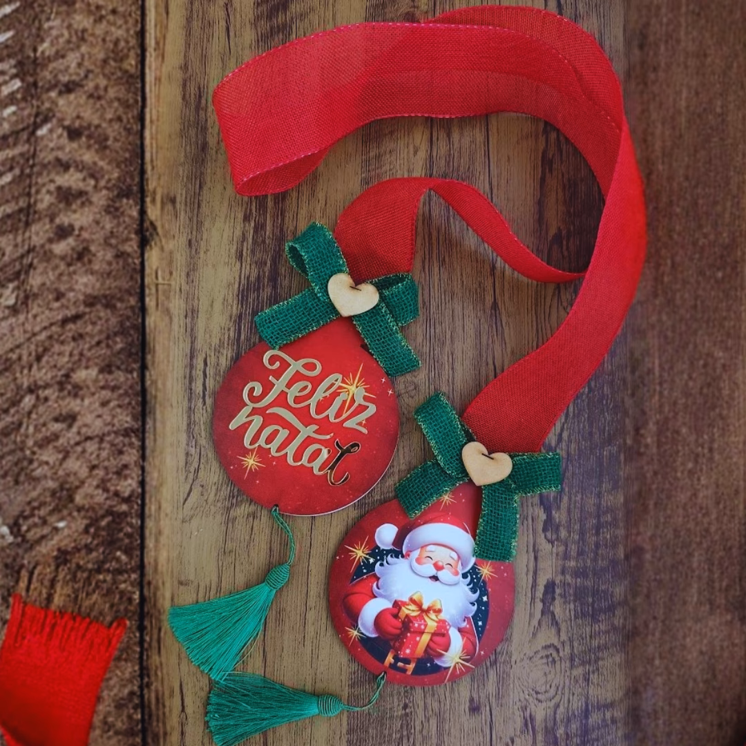 Medidas do pingente: 14cm x 18cm 1 pingente é personalizado com imagem do Papai Noel e 1 pingente com Feliz Natal em relevo de acrílico espelhado dourado.Fita para passar na porta na medida de 1,40mt.* Laços podem alterar conforme disponibi...