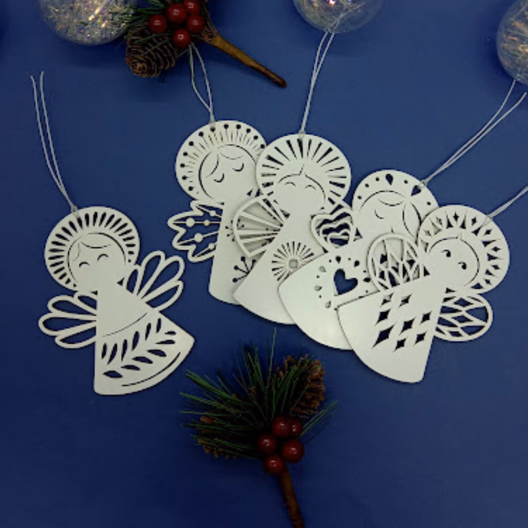 Kit 5 anjos Produzido em MDF BRANCO ou MDF CRU Cada kit deve ser do mesmo MDF. Medidas: 8cm de altura e largura proporcional, acompanha cordão