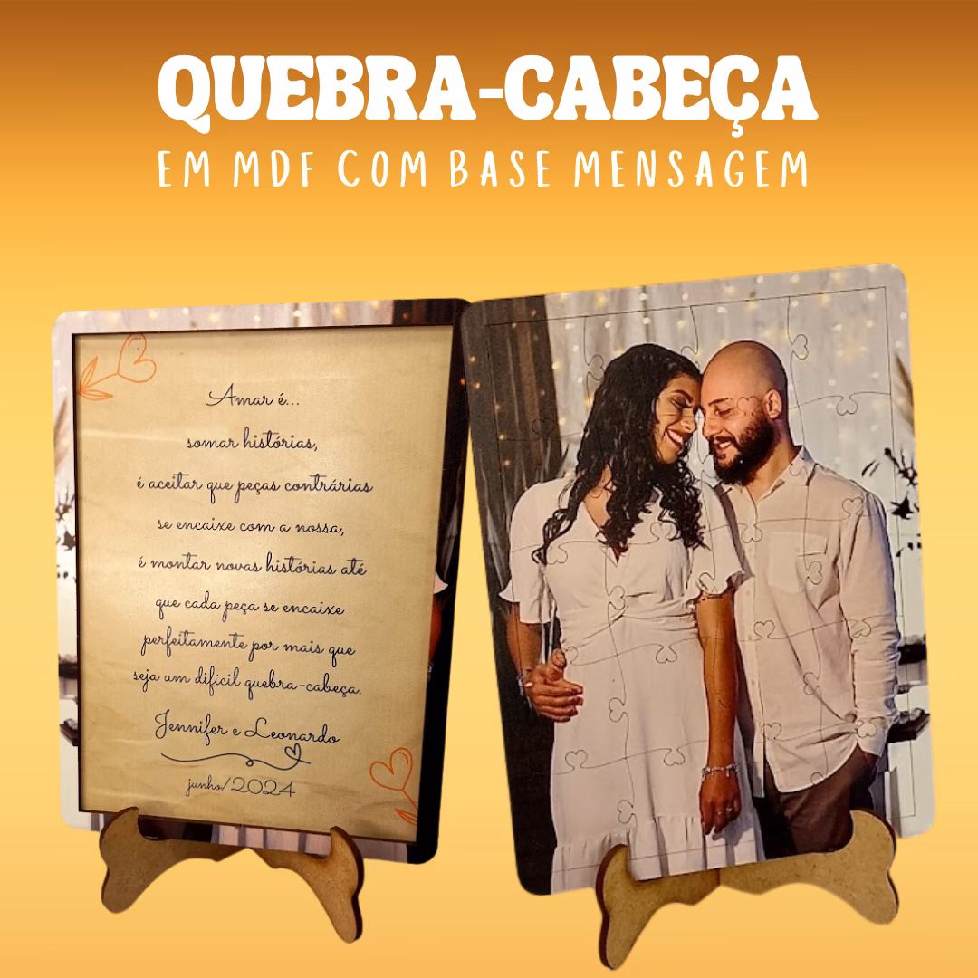 Quebra-Cabeça 15x21 em MDF personalizado com sua foto preferida Cada encaixe do quebra-cabeça tem desenho de 1 coração Acompanha base moldura com declaração que você personaliza do seu jeitinho Acompanha suporte