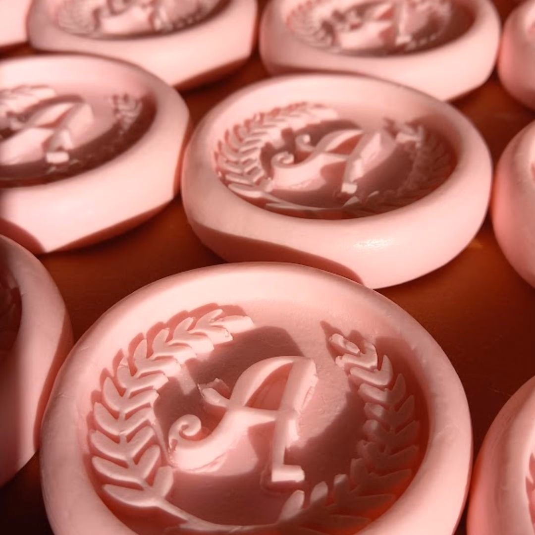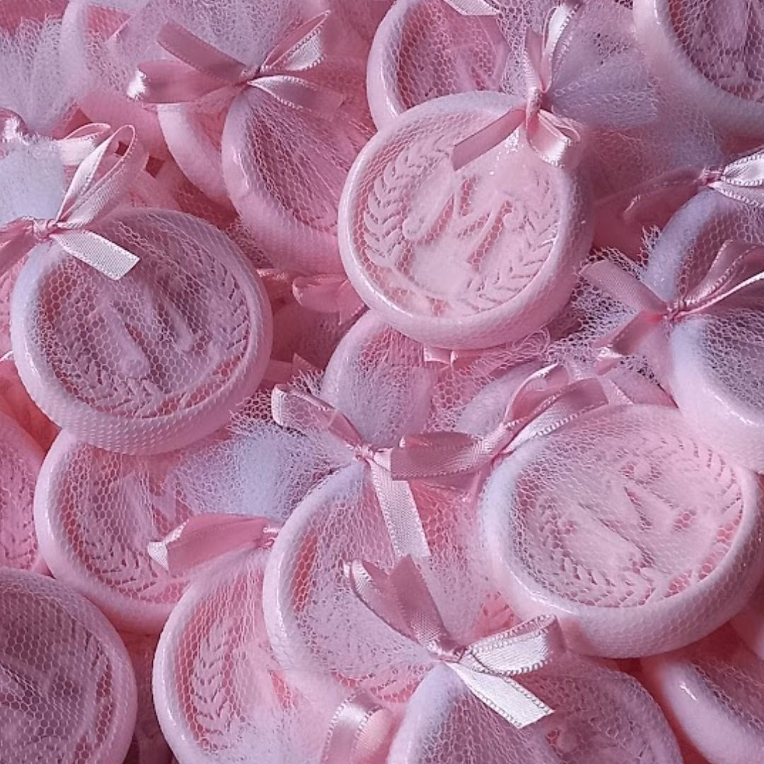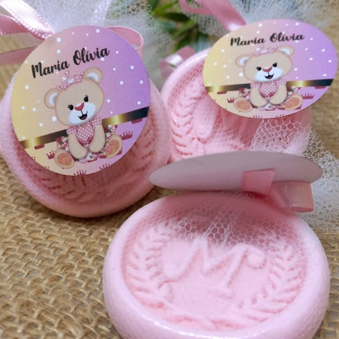 Sabonete Brasão Inicial (Com 1 letra) Embalado individualmente com filme e tule. Cada embalagem acompanha tag personalizada. Medida 6cm diâmetro. Todas as letras disponíveis SOMENTE em cores primárias. Essência Baby ou Flores.