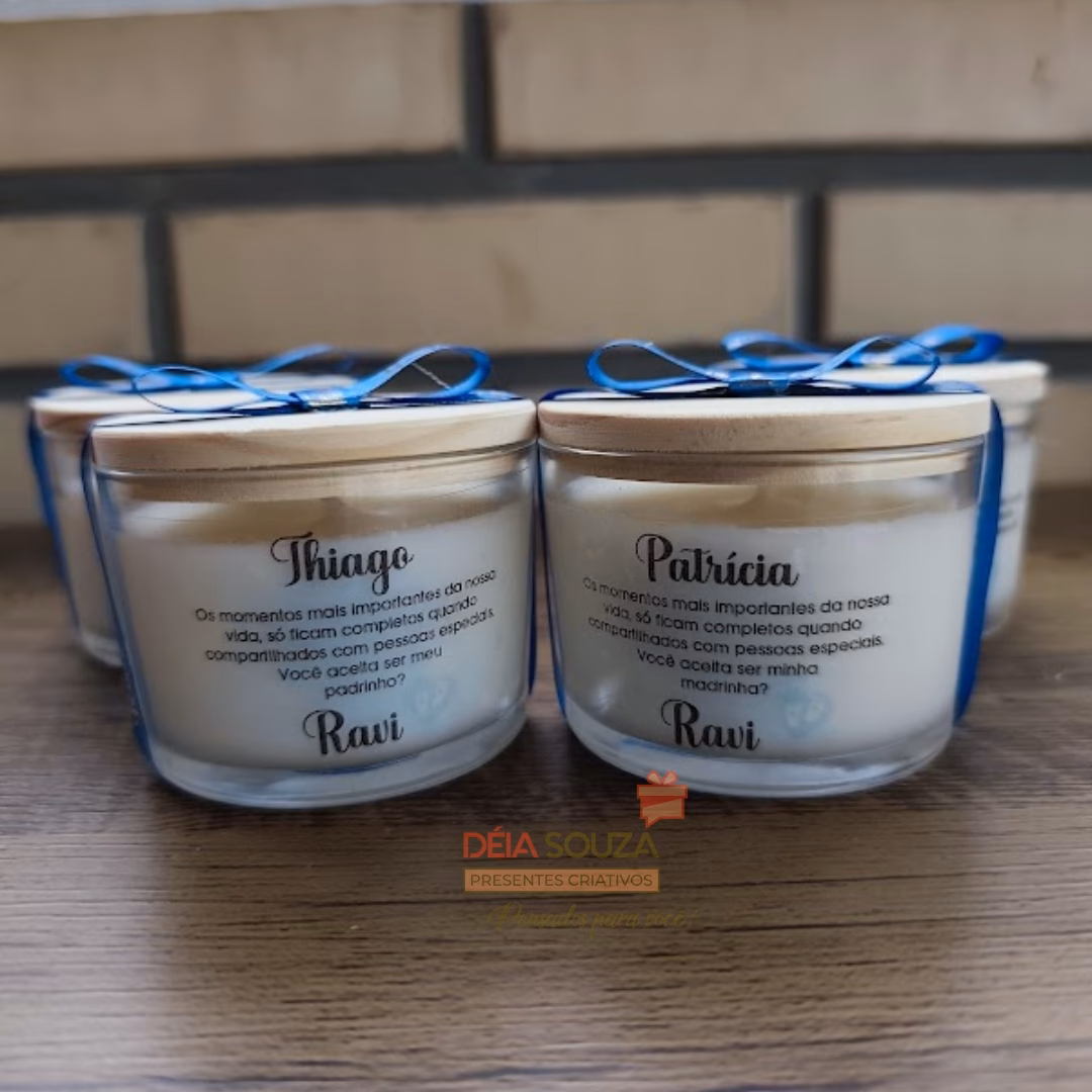 Vela Aromática em Vidro com rolha. Rótulo frontal personalizado . Embalado em saco de organza